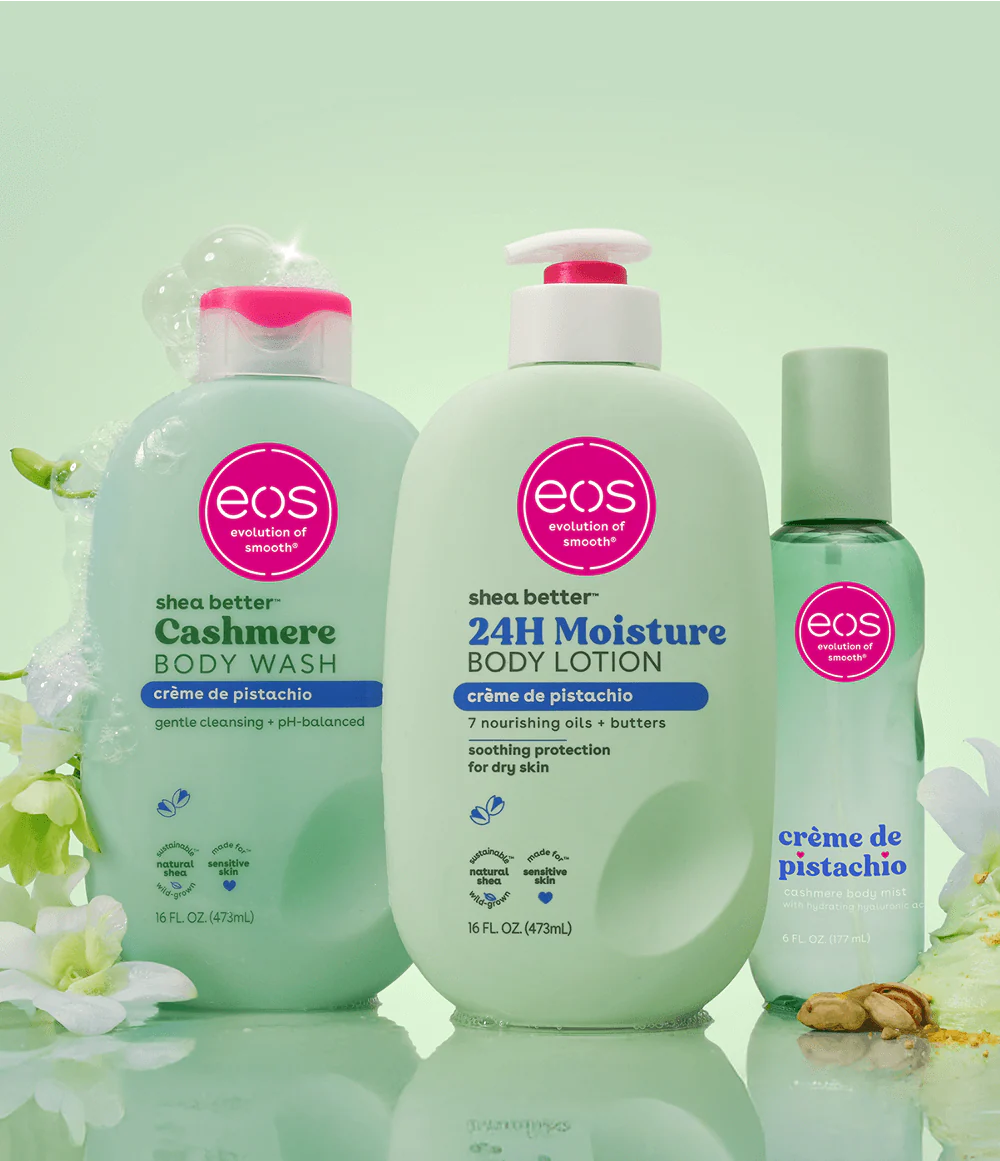 A warm swirl of toasted pistachio, creamy vanilla toffee, and soft blonde woods settles into skin with a lingering, elevated scent. The dream trio of deep hydration and a final spritz that completes your sweetest routine.