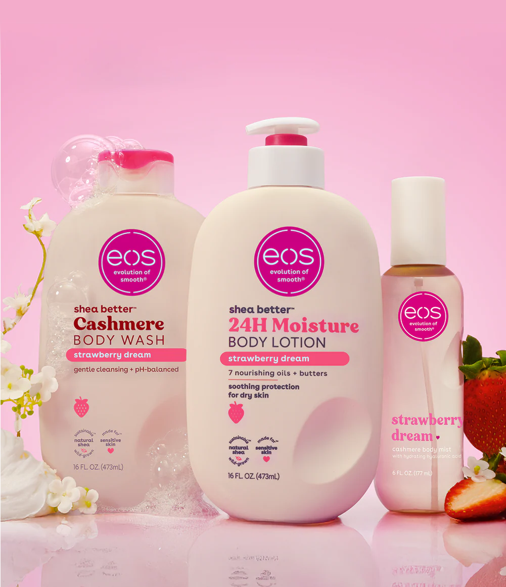 Float into a cloud of soft strawberry sweetness with this silky, scent-layering trio that nourishes, smooths, and layers a light, creamy scent from shower to mist.